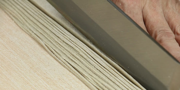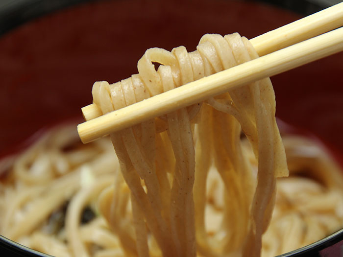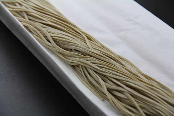 裁ちそばは、つなぎを一切使わないお蕎麦です。折り重ねてしまうとボロボロと切れてしまいます。 小さく分割して丸めたそば生地を、同じ大きさにのして広げ、それを数十枚重ねて切っていきます。切り方も、普通のそばのように大きなそば包丁は使わず、 長めの菜切り包丁を使います。添えた手を定規のようにして、布を裁つように包丁を手前に引いて切っていきます。「裁ちそば」という名前は、この切る様子から名付けられたそうです。