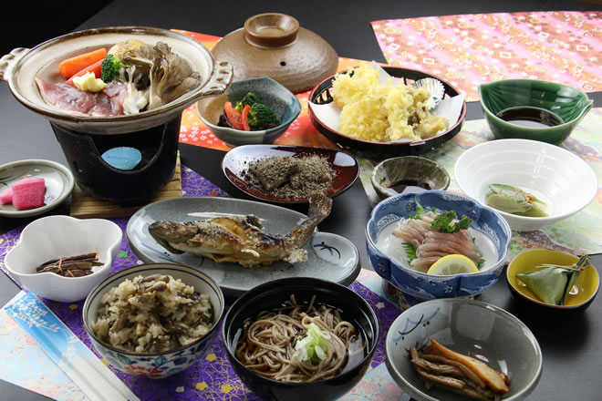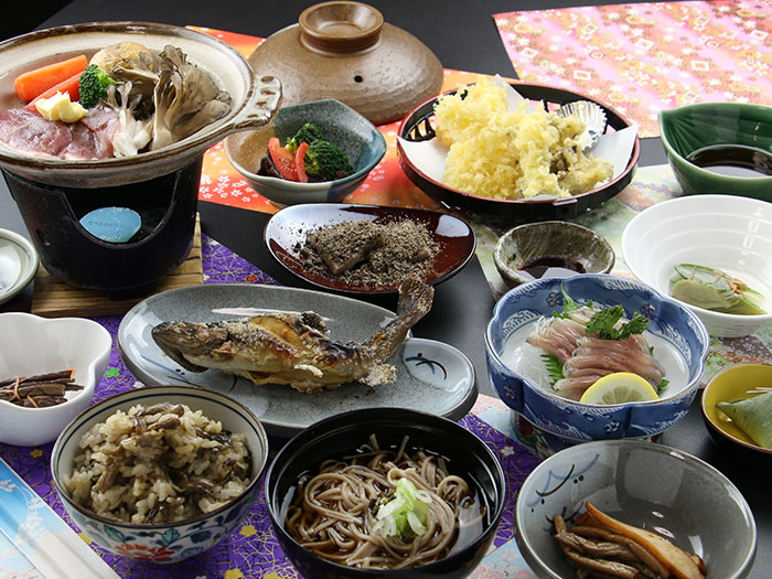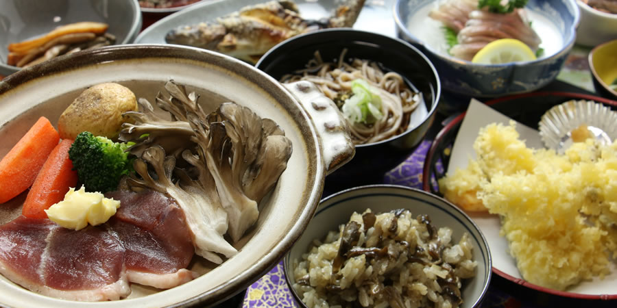当宿の料理は、会津檜枝岐の地物を使った、山の幸たっぷりの「山人料理」。山菜、きのこなどの天然素材をはじめ、イワナのお刺身、きのこご飯、そば粉十割で手打ちする裁ちそばなどが並びます。 春は山菜、秋はきのこを自ら採ってくるので、新鮮な食材を、素材の味そのままにお出しできるのです。すべて天然物を使用するため、季節ごとメニューの内容は変わります。ぜひ、檜枝岐の幸、旬の味をご堪能ください。