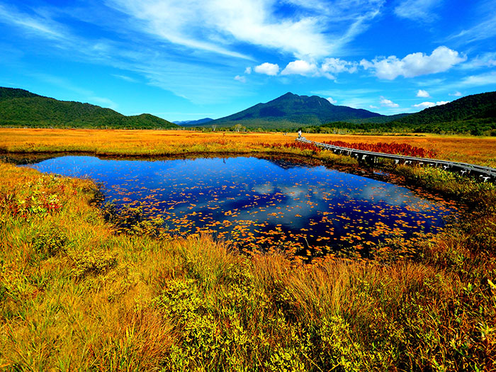 福島県・栃木県・群馬県・新潟県の4県にまたがる日本を代表する国立公園です。尾瀬沼は燧ヶ岳の火山活動で噴出した溶岩流が、只見川などの源流をせき止めてできたものだといわれています。 東西6km、南北2kmにわたる湿原は、あちこちに澄んだ水をたたえています。例年、5月から9月上旬まで高山植物が咲き誇り、9月下旬頃には一足早く迎える秋の尾瀬ヶ原には草紅葉が広がります。